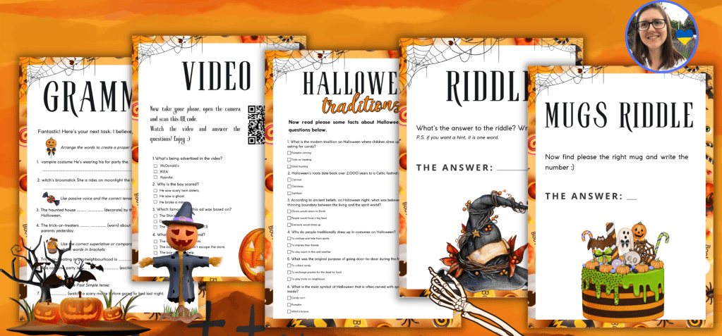Create around 5-8 tasks that are bright, colorful, and Halloween-themed. These tasks can range from grammar exercises to riddles, puzzles, and even short videos with questions. For ESL learners, include exercises that reinforce grammar, vocabulary, and Halloween-related facts.