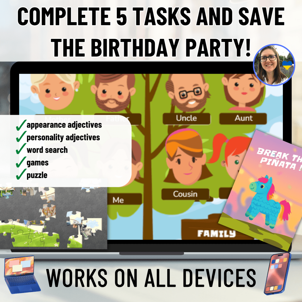 - Family Vocabulary: Interactive drag-and-drop games and reading comprehension.